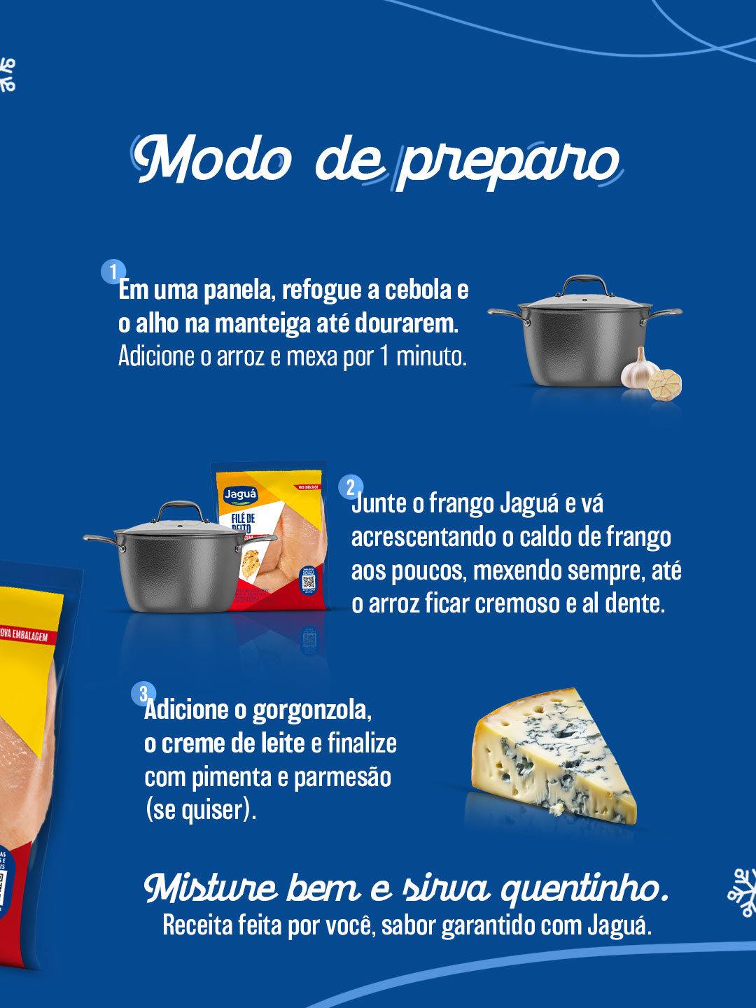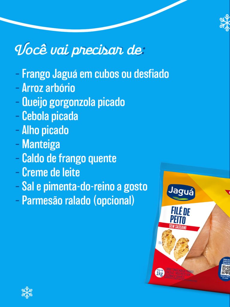 O risoto de frango com gorgonzola tem aquele sabor intenso e cremoso que abraça. Fácil de fazer e ainda melhor com frango Jaguá.